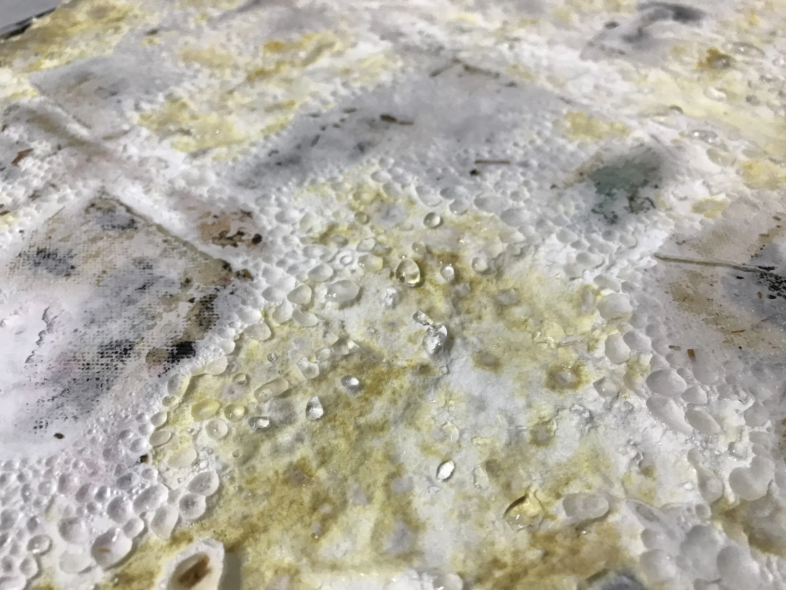 detail, Bloom (shaggy), Rachel Crummy, 2023 ~ mixed media on canvas, hemp, reishi mycelium, wood, 21 x 14 inches