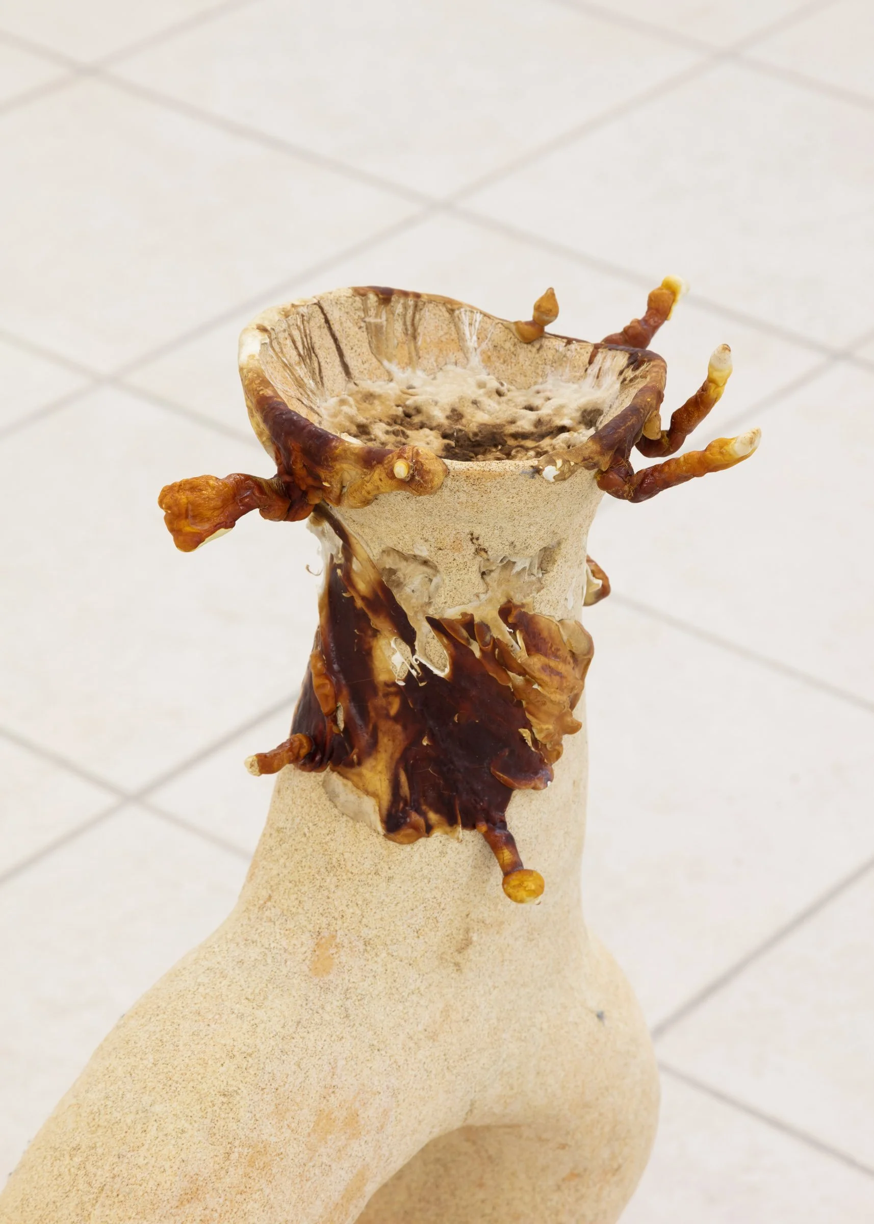 R – detail, lemniscate, Tara Dougans, 2023 ~ stoneware, glaze, sand, hemp, reishi mycelium, 22.5” x 6.5” x 27” (growing)