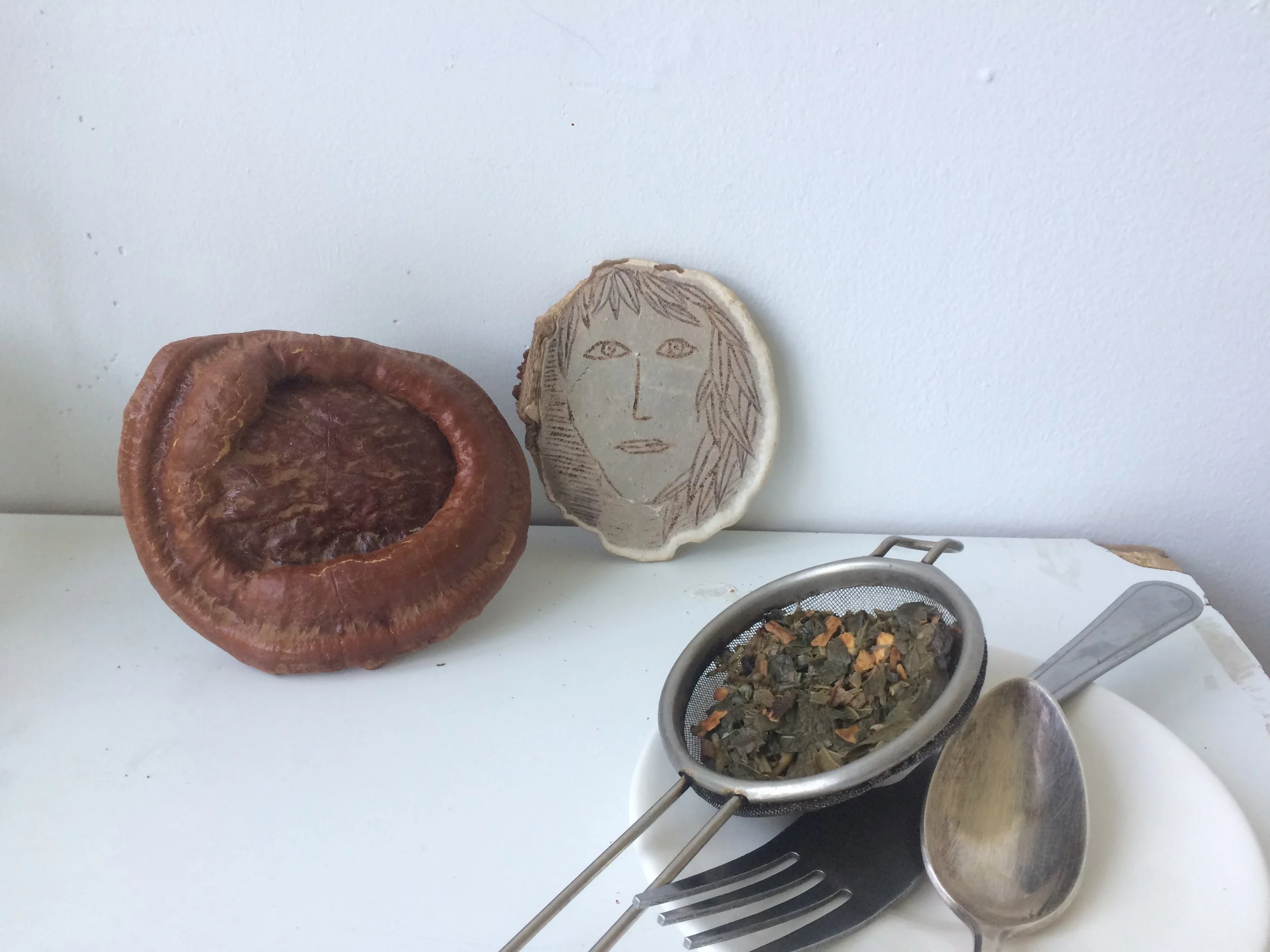 Jade stone and alder flower essence combined with oil paint, the sea surrounding Fogo Island, pieces of plastic picked from the shoreline, burnette horses counted from the car; Ganoderma Lucidum merged with hemp fibre, canvas, and wood within its tapestry of tissue; Streams of sonicscape, the soundfield of the breeze amongst the blooming sumac along Caledonia Road and movement near the gazebo; Scoby — once a source of slightly effervescent kombucha; once a slippery surface floating and fermenting sweet tea — hangs as a flag, mother, motherland; aura of the earth, electromagnetic noise from various recent everydays and early days; lichen on stone, the texture of a meadow with blades of grass cupping dew, twigs, roots intertwined deep; a duck nest along with duck feathers and duck eggs, a steady single drip drip drip drip drip drip drip from the basement ceiling; fruiting reishi mushroom filling the form of ceramic vessels: sphere, shelllike cornucopia, pelvis, and lemniscate as in the geometry equation with two loops which meet at zero also referred to as the infinity symbol also seen as a eight lying lazy; paper pulp fossilized record of touch pinched with fingers, calyx: the leaflike sepals which enclose the petals, a cup-shaped cavity, and dorsal: relating to the back of an animal, plant, or organ.
