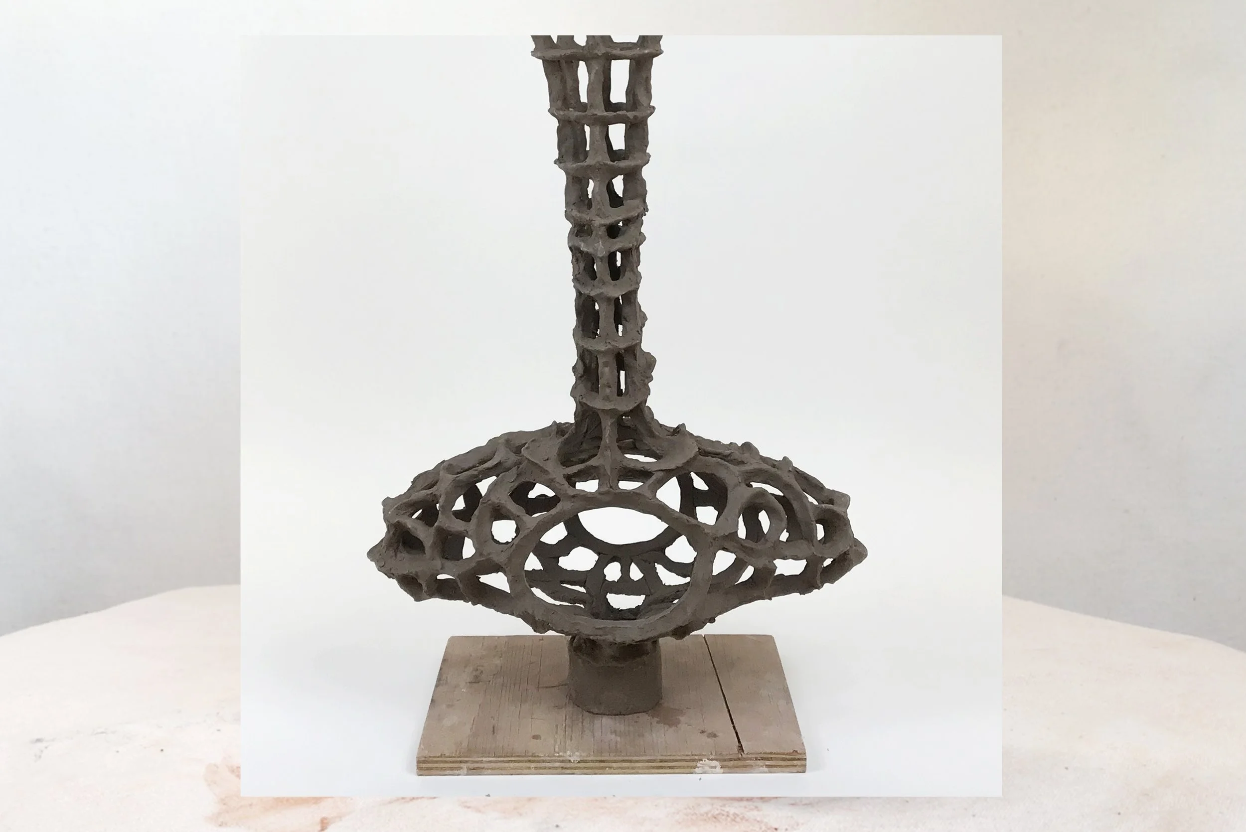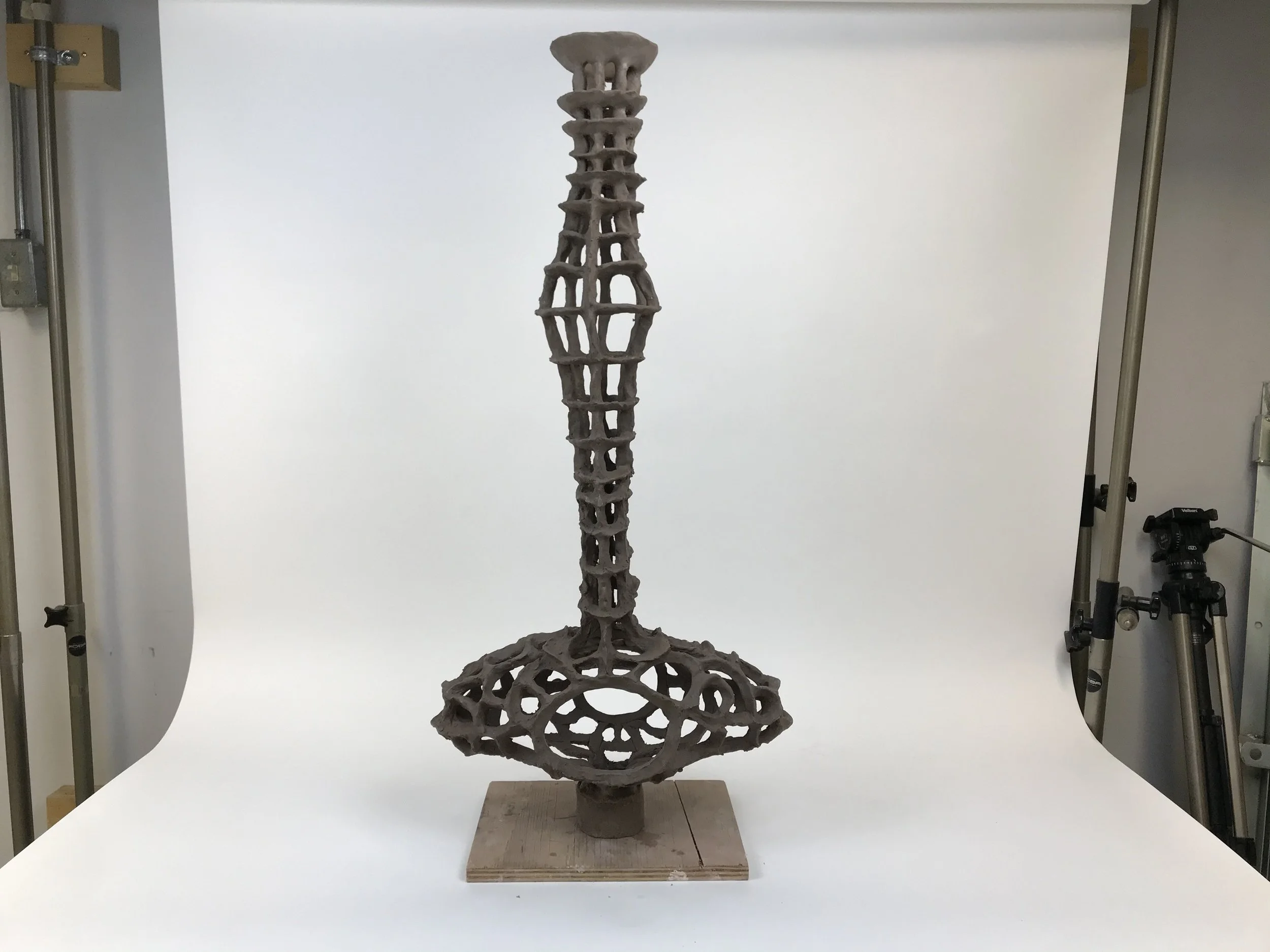 lemniscate, Tara Dougans, 2023, stoneware, glaze, sand, hemp, reishi mycelium, 22.5” x 6.5” x 27” (growing)