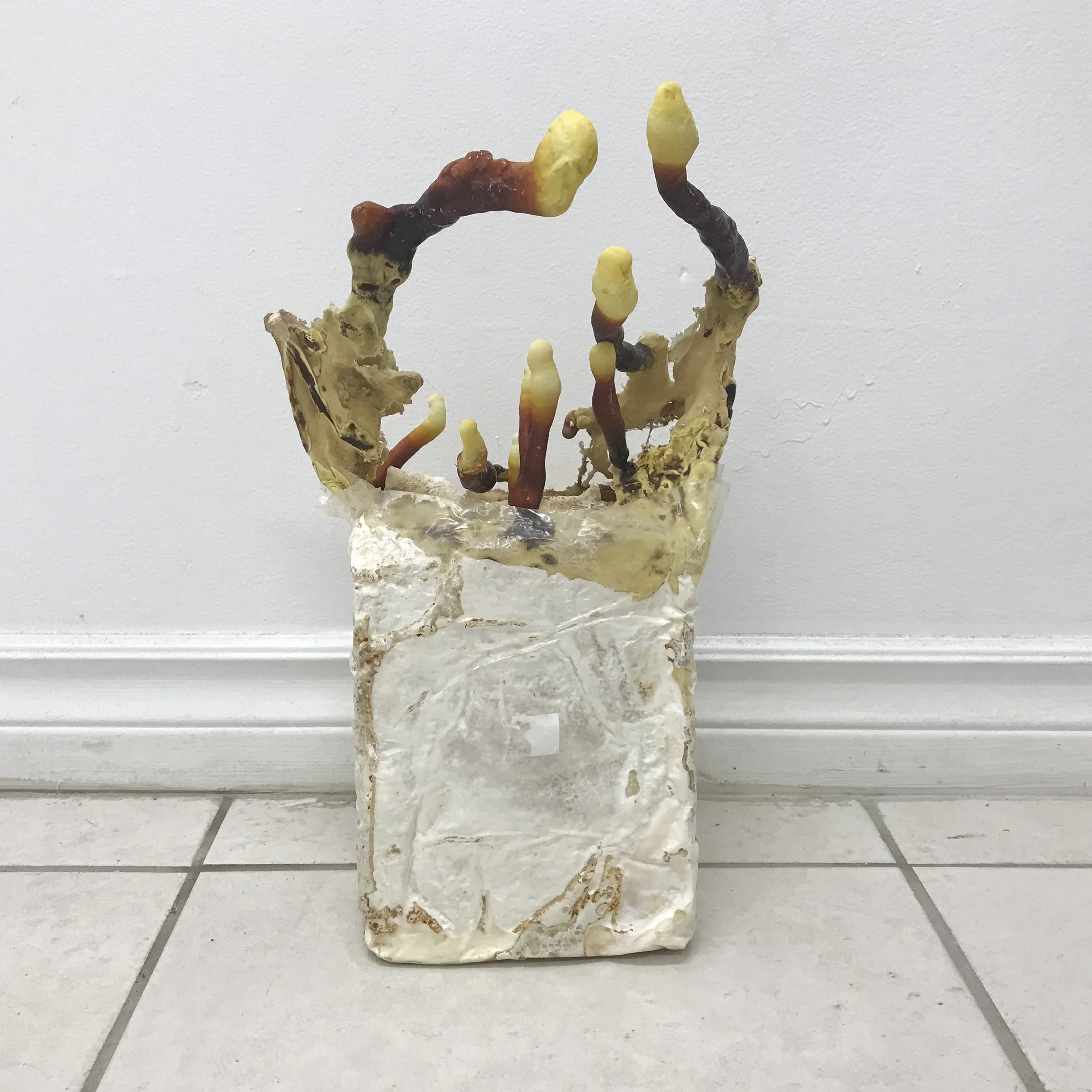 lingham, Tara Dougans, 2023 ~ stoneware, glaze, hemp, reishi mycelium, 16” x 4.5” x 14.25” (growing)