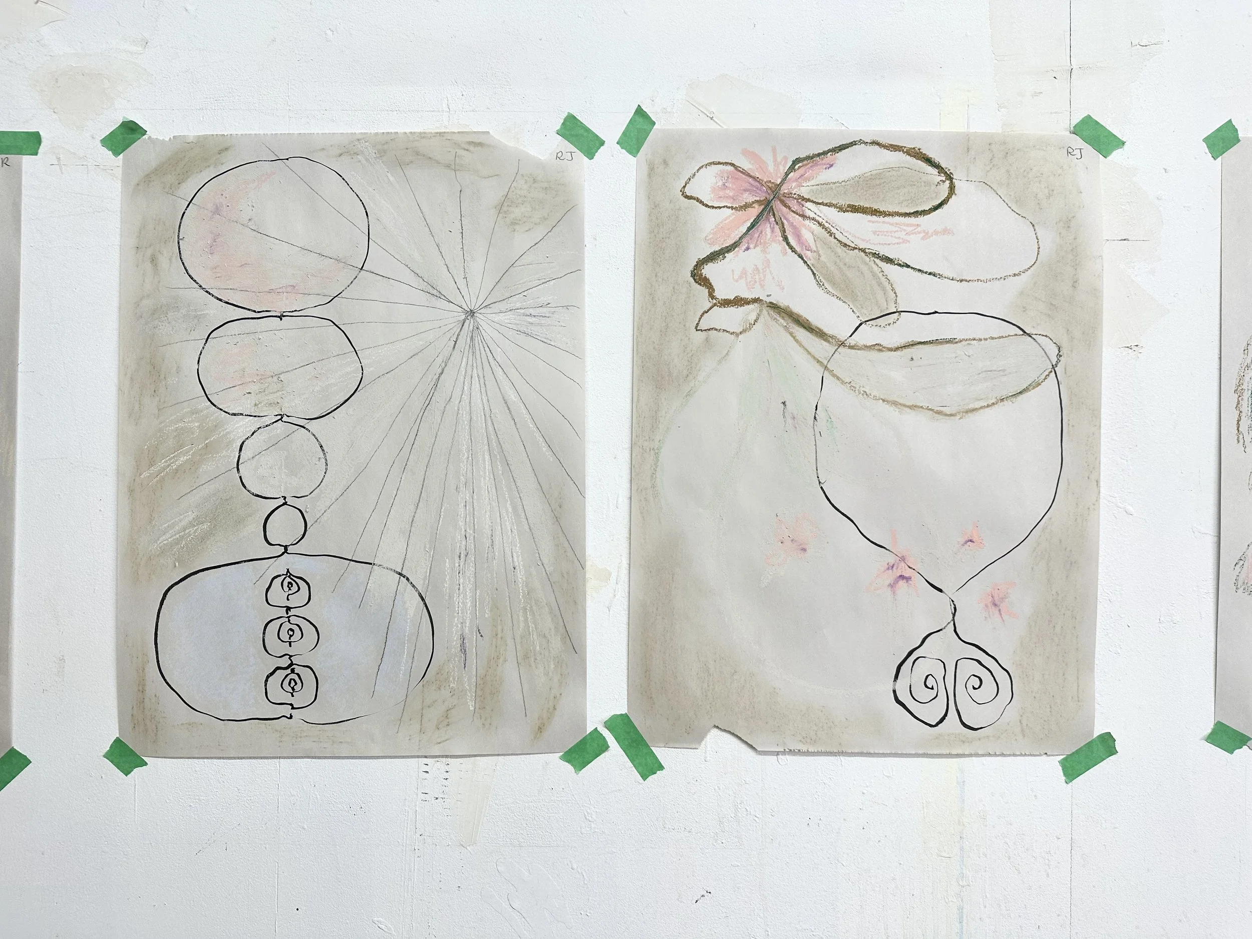 With Continuum, we slow down and become intimate with internal rhythms, inviting a fluid intelligence beyond the thinking mind. When we tune our minds and bodies in this way, drawing then becomes an embodied expression of the present moment. What can listening together teach us about collective emergence? What does it mean to relate, and make, from this place? Continuum offers us access to sensations flowing below our habitual attention, while drawing offers us a portal for expressing this fluid matrix, enabling us to share in a non verbal form.