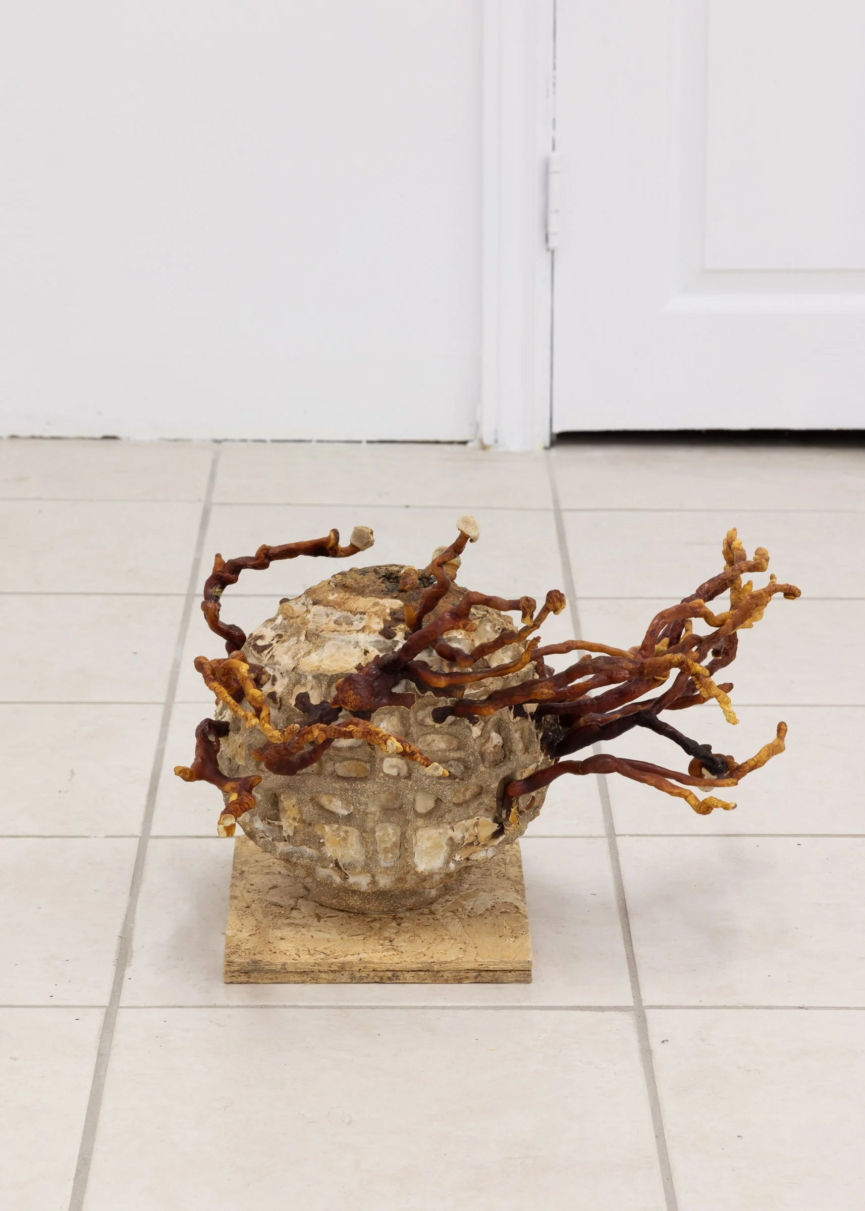 L – sphere, Tara Dougans, 2023, stoneware, burlap, hemp, reishi mycelium